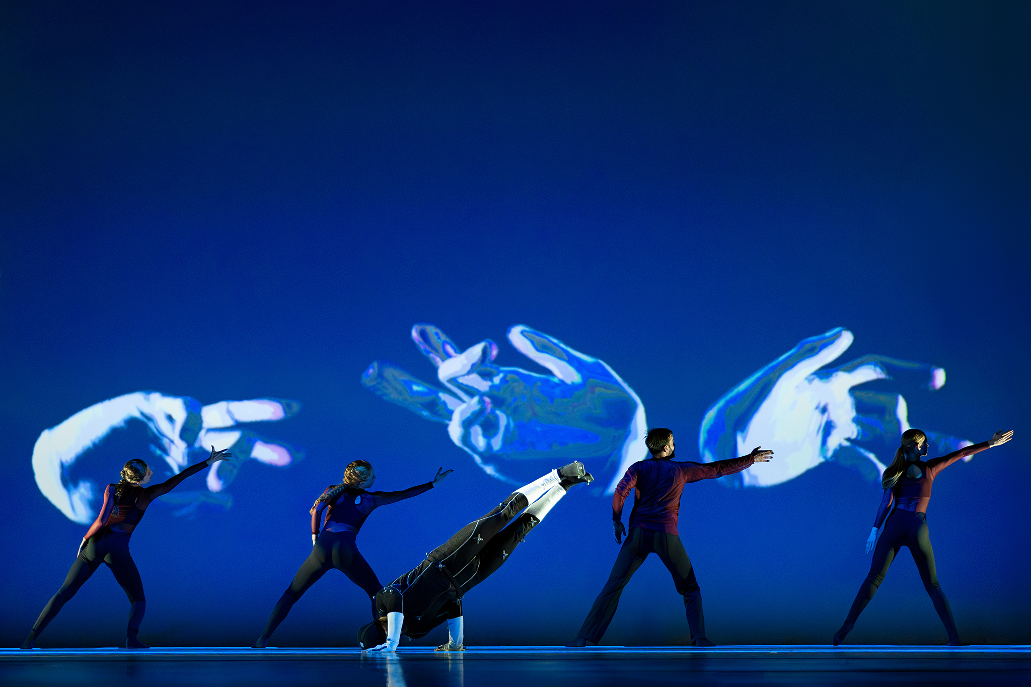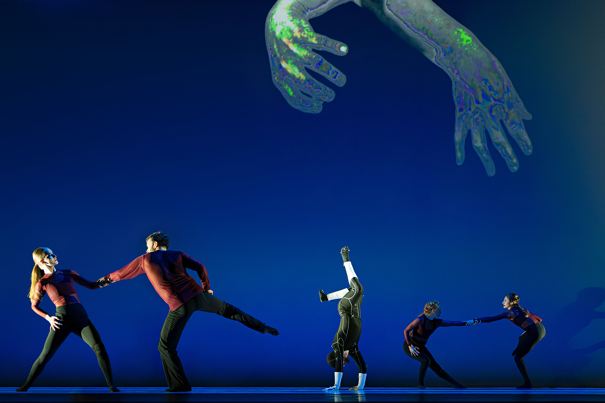 Virtuele handen bewegen mee via motion capture, terwijl in het werk Arms drones samen een bovenlijf vormen dat reageert op improviserende dansers. Zo ontstaat een directe dialoog tussen mens en machine, waarin technologie niet alleen ondersteunt, maar zelf lijkt mee te voelen.